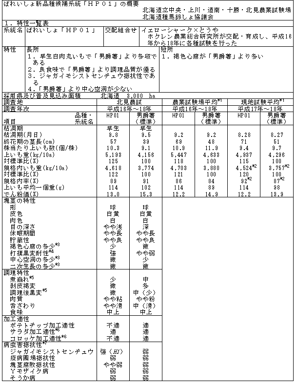 「HP01」は、「男爵薯」並の早生で、収量は「男爵薯」より20%程度多い。塊茎も「男爵薯」と同様球形で白肉であり、貯蔵性も「男爵薯」並に優れる。さらに、食感が優れ良食味であり調理