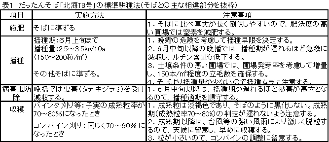 6)以上の結果より、だったんそばの標準耕種法を表1の通りまとめた。