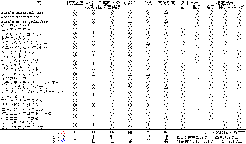 1)品目選定:場内栽培試験より3年以上のデータがある品目より畦畔、のり面に有望なグラウンドカバープランツの特性表(表1)を作成した。