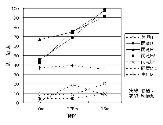 栽植間隔:株間50、75、100cm 栽植様式:1条畦中央、肩、2条千鳥、2条並木