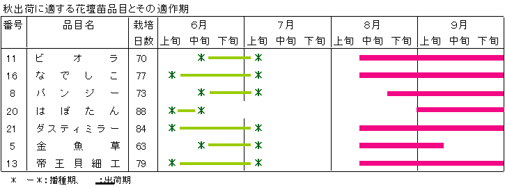 作期、草姿、観賞期間等の観点から、秋出荷に適した花壇苗品目を選定し、適作期を示した。