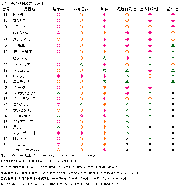 た。栽培適性、観賞適性ともに高く、有望と思われたのは、ダスティミラー、ビオラ、なでしこ、パンジー、金魚草、帝王貝細工、はぼたんの7品目であった(表1)。