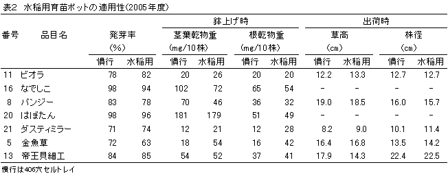 供試品目は全て水稲育苗用ポットで稚苗育成可能であり、導入にかかるコストを軽減できる(表2)。