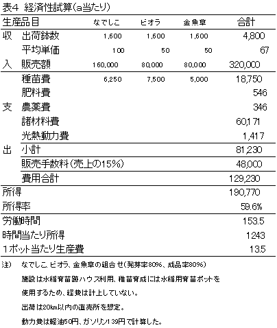 算され、直売所への出荷を想定したモデルケースでは1aで19万円程度の所得が見込めると考えられた(表4)。試験販売では売れ行きは概ね好調で、なでしこ等越冬性のある品目の人