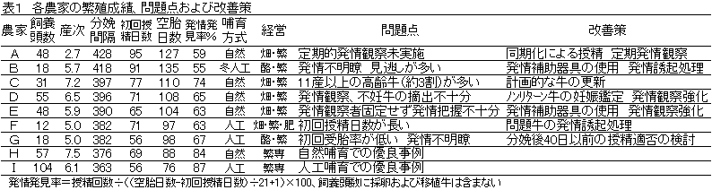 発情観察が不十分になる事例がみられた。発情観察の強化、発情発見補助器 具の使用、発情誘起処理、計画的な繁殖雌牛の更新、早期妊娠鑑定などが対策として考えられた。