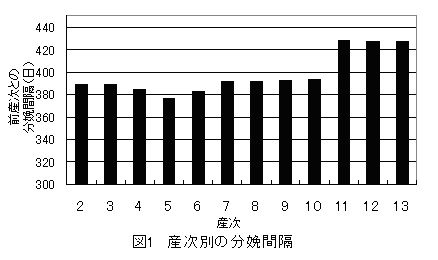 1)-2 産次ごとの分娩間隔は、4産次と5産次の間が377日と最も短く、11産以上になると420日を超えていた。(図1)。
