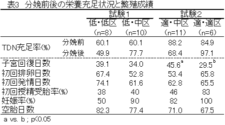 他の3区では62〜66日と差がなかった。分娩後112日以内の 妊娠率は低・低区のみが50%と低く、初回授精受胎率はTDN充足率が高いほど良好な傾 向がみられ、適・適区