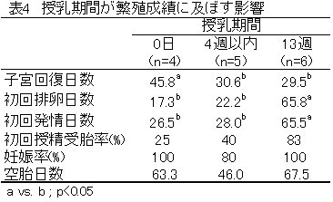 20日、初回発情日数も28日以下となり、13週の66、66日に比べて大幅に短縮し た(表4)。これらは、子牛による吸乳刺激が無いためと考えられた。