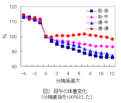 較したところ、母牛の分娩後体重変化は栄養充足状況を反映し、分娩後体重を維持していたのは適・適区のみであった(図2)。また、初回発情日数は低 ・低区で74日と最も長く、