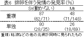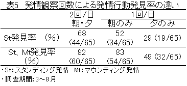 低下した(表5)。排卵を伴う発情の発見率はスタンディング発情が見られたときに87%と最も高く、マウンティングでは48%と低かった(表6)。