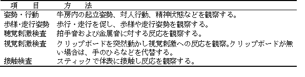 3)臨床症状検査:姿勢・行動の変化、歩様・走行姿勢、聴覚刺激、視覚刺激および接触の各検査を、発症予測時期より毎週実施した(表1)