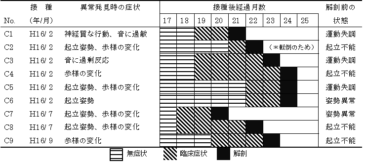 3)これらの臨床症状は、臨床変化の発見から解剖まで2〜6ヶ月間、漸進的に推移し、とくに起立姿勢の異常と後肢の運動失調などが進行性に観察された。解剖時には9頭中4頭が起