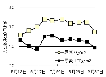![]() 図1 尿素100g/m2表面添加の有無におけるカビ数 |