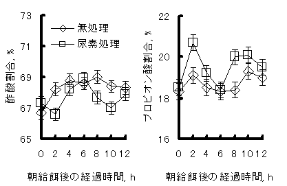 ![]() 図2 ルーメン内容液中VFAの酢酸とプロピオン酸割合 |