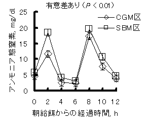 5)尿素添加でん粉粕サイレージと併給する蛋白質源としては、大豆粕(SBM)よりコーングルテンミール(CGM)の方がルーメン内アンモニア濃度の急増を抑えることができる(図3)。