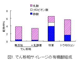 (1) でん粉粕は高水分でかつサイレージ発酵の基質である単少糖類が少ないものの密封貯蔵すれば、乳酸菌を添加しなくても乳酸、酢酸のみからなる良質なサイレージが調製できることが明らかとなった。(図1)。