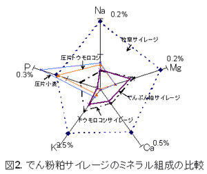 (3) でん粉粕(原料およびサイレージ)にはリン(P)はほとんど含まれず、カリウム(K)含量は約0.7%で、穀類より高いものの粗飼料よりも低かった(図2)。