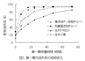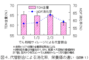 (4) でん粉粕サイレージのTDN含量は平均値で76%と査定され、濃厚飼料並みのエネルギー価であり、第一胃内における消化速度は13%/時と穀類より高かった(図3)。でん粉粕サイレージで圧片トウモロコシを代替すると、代替率が2/3(飼料中の混合割合は20%)までは、消化率、栄養価が変わらないが、すべて代替すると消化率、栄養価ともに低下した(図4)。