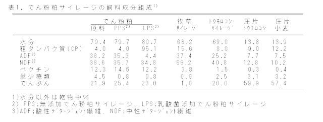 (2) でん粉粕サイレージは粗タンパク質含量が4%と穀類の約半分で、繊維含量は3-4倍と高く、穀類やイネ科牧草にはほとんど含まれていないペクチンが約10%含まれた(表1)。