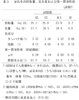 ![]() (5) 圧片トウモロコシの一部をでん粉粕サイレージで代替したTMRを摂取した泌乳牛の血液性状および第一胃液性状は正常値の範囲にあった。飼料中の混合割合を16%とした場合は、0%あるいは8%混合した場合に比べ、飼料全体の摂取量が低下し乳量も減少した(表2)。試験2の結果、CS区の乾物摂取量はGS区と遜色なく、乳成分、乳量も差がなかったものの、第一胃内のpHが牧草サイレージ摂取時よりも低かった(表2)。