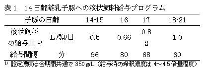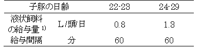 れなかった。22日齢離乳子豚への液状飼料給与プログラムは、14日齢離乳子豚のプログラムを変更することで対応が可能であった(表3)。