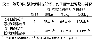 れなかった(図2)。その結果、21日齢で離乳した子豚よりも30kg到達日齢が約4日、肥育終了時(105kg到達)の日齢が約10日短縮された(表2)。