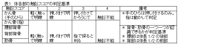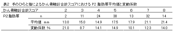 得られた触診スコアとP2脂肪厚の関係を検討した結果、かん骨を手のひらおよび指で触診したスコアの合計値におけるP2脂肪厚の変動係数は概ね15%以下であり、従来のBCS法