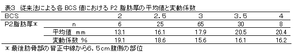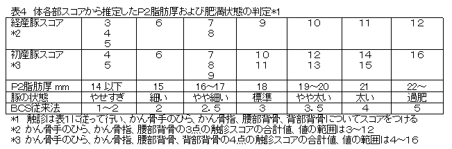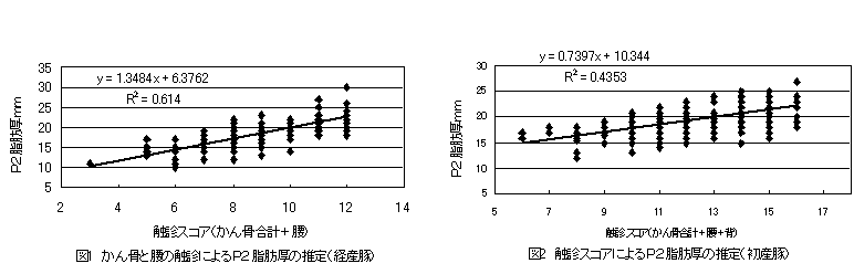 階で触診スコアからP2脂肪厚を推定する回帰式を求め(図1、2)、これをもとに触診スコアからP2脂肪厚を推定し肥満程度を判定する方法を明らかにした(表4)。
