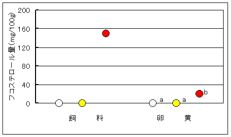 図1 供試飼料および卵黄中のDHA量                         図2 供試飼料および卵黄中のフコステロール量