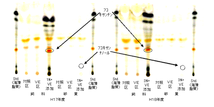 未利用海藻であるアイヌワカメには、抗アレルギー成分を含むω3系列関連脂肪酸と高コレステロール障害を抑制するフコステロールおよび抗肥満効果が期待されるフコキサンチン等の脂溶性の機能性成分が含まれている。アイヌワカメを処理したものを飼料に添加し、不断給餌条件下で、これらの機能性成分が鶏卵及び鶏肉中へ移行する可能性について調査する。