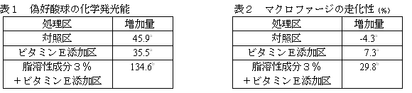 また、脂溶性成分3%添加でも偽好酸球の化学発光能・マクロファージの走化性が有意に高くなり、鶏の自然免疫機能の向上が示唆された。(表1、2)。