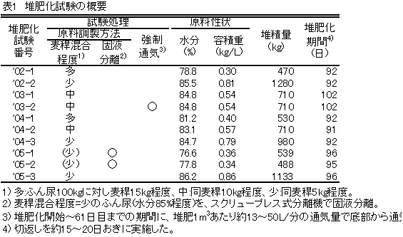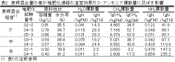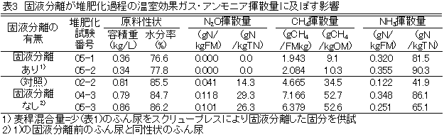(3) 麦稈混合量が少ないふん尿を固液分離により容積重調整して堆肥化したところ、分離前ふん尿の堆肥化に比べ温室効果ガス揮散量は顕著に低下し、アンモニア揮散量は同程度で
