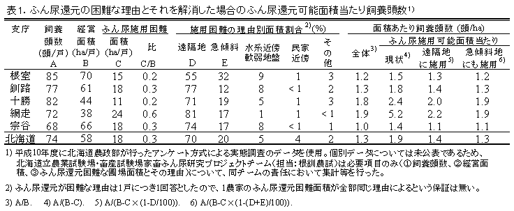 1) 北海道の40%の酪農家はふん尿還元困難な圃場を有しており、その圃場面積は各経営面積の平均30%程度と見積もられた。この結果、ふん尿還元困難な圃場面積は、全調査酪農家