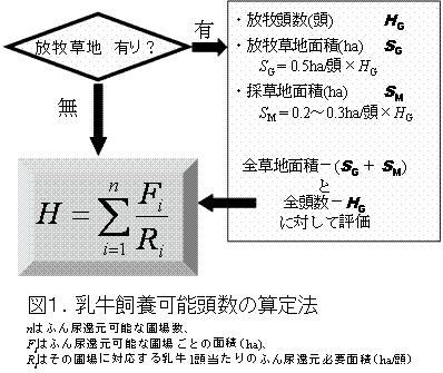 ここで、nはふん尿還元可能な圃場数、Fiはふん尿還元可能な圃場ごとの面積(ha)、Riはその圃場に対応する乳牛1頭当たりのふん尿還元必要面積(ha/頭)。