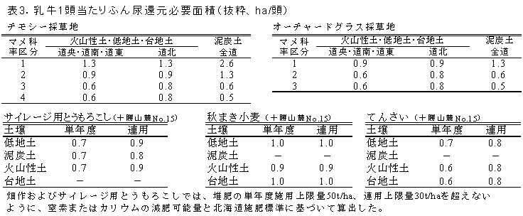 ふん尿還元可能な圃場に対し、各圃場面積を、乳牛における排泄量の原単位(表2)と肥効率および北海道施肥標準によって設定された乳牛1頭当たりのふん尿還元必要面積(表3)で除