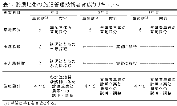 農業試験場や農業改良普及センター等、施肥管理技術を有する者を講師として、下記のカリキュラムによって施肥管理技術者を少なくとも3人育成する(表1)。