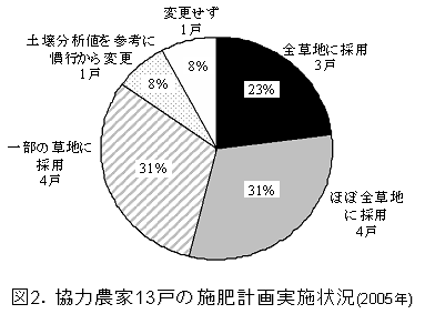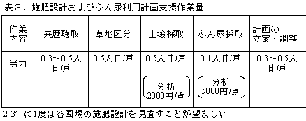 ①飼養頭数、面積、土地利用区分、土壌理化学性、ふん尿の化学性、管理来歴(ふん尿施用履歴等)などの調査を行い、各農家の施肥設計とふん尿利用計画を立案する。