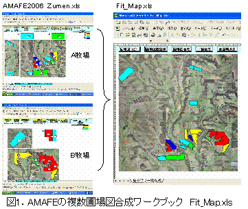 ④施肥設計・ふん尿利用計画の策定では、個別農家対応のふん尿利用計画支援ソフトAMAFE2006を活用するため、個別のふん尿利用計画圃場図を地域に統合するワークブック