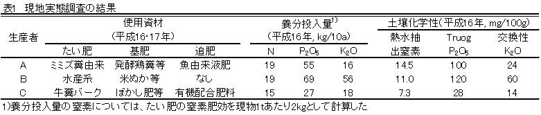 1)有機栽培を行う各生産者の基肥および追肥方法は生産者間で大きく異なり(表1)、生産性は不安定であった。また、生産者圃場の土壌養分状態について、窒素・リン酸の肥沃度が高