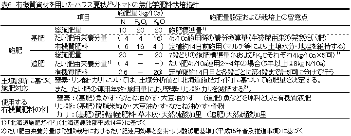 た。有機質資材を用いたハウス夏秋どりトマトの本圃における無化学肥料栽培指針を策定した(表6)。