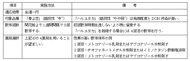 9) 上記6),7),8)より春まき小麦の赤かび病に対する薬剤防除対策を下の表に示した.