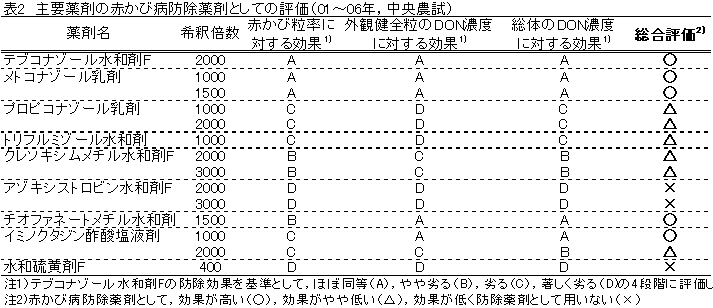 6) 赤かび粒率,外観健全粒のDON汚染,および赤かび粒も含めた総体のDON汚染に対する防除効果を総合的に評価した結果,メトコナゾール乳剤(1000〜1500倍),テブコナゾール