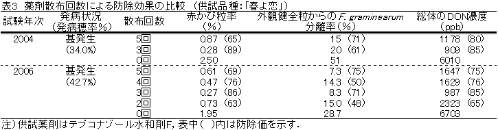 粒も含めた総体のDON汚染に対する防除効果もほぼ同等であった(表3).