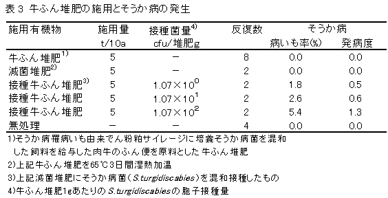 た堆肥を土壌に施用してばれいしょを栽培しても、そうか病の発病は認められなかった(表3)。