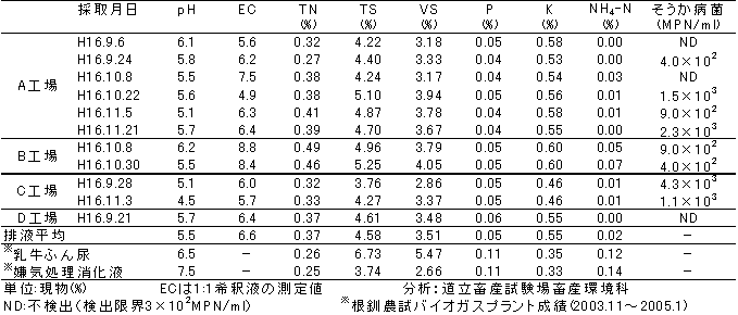 供試原料:でん粉製造排液および根釧農試搾乳牛のふん尿スラリー