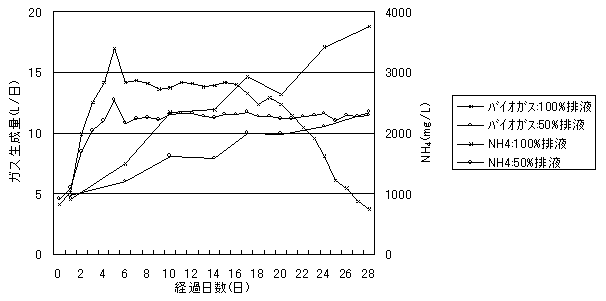 図1 バイオガス生成量と NH4濃度(醗酵温度38℃)