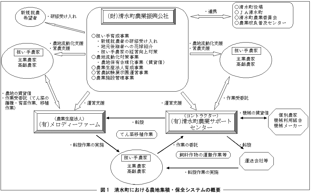 1)清水町では、地域農業の活性化に向けて、96年3月に「清水町農業・農村活性化ビジョン」を策定・公表し、これに基づいて農業生産法人、コントラクターおよび市町村農業公社の3者か