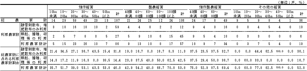 規模を拡大しやすい環境を整えている。一方、畑作経営における利用は融雪剤散布や堆肥散布が中心で、播種や収穫などの作業受託は一部にとどまっている(表2)。