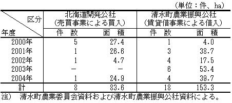 153.3haとなっており、同時期に北海道農業開発公社が清水町で行った農地保有合理化事業(売買事業)による買入面積の総計83.6haを大幅に上回っている(表3)。このことから、清水