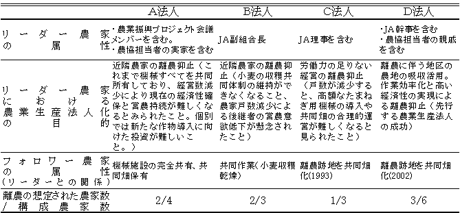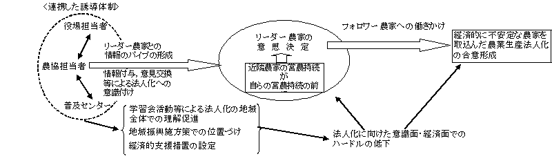 2)検討項目:①農業生産法人の設立に対する農協,役場の係わりの整理,②A法人の収益性の計測,③A法人の「地域」に対する便益の計測,④対象地域における農業生産法人誘導